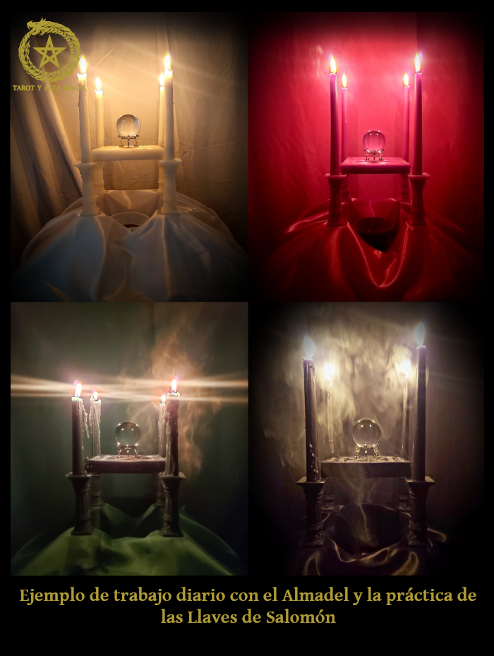 Clavicula Salomonis se traduce del latín "Las Llaves de Salomón", son grimorios del SXVII que se atribuyen al Rey Salomón, se componen de varios libros. Siendo uno de ellos el "Ars Goetia" sería algo así como "Arte de la Brujería"(en latín medieval, el arte de la goecia, que significa brujería -del griego γοητεία, goēteia-) contiene las descripciones de los 72 Genios que se dice que Salomón invocó, encerró en vasijas de bronce selladas mediante símbolos mágicos y obligó a trabajar para él. El libro asigna un rango y un título de nobleza a los miembros de la jerarquía infernal, y un sello sagrado "al que deben lealtad". Además, esta parte enseña a construir una vasija de bronce similar a las de Salomón y a usar las fórmulas mágicas para llamar controlar y someter a la voluntad del mago a estos Djinn. El libro se divide en cinco partes, que constituyen tratados sobre diferentes materias: Ars Goetia (demonología e invocación de Djinns), Ars Theurgia Goetia (clasificación de espíritus aéreos y su invocación), Ars Paulina (angelología e invocación de ángeles), Ars Armadel (construcción de un almadel) y Ars Notoria (rezos mágicos). Este método para hacer praxis mágica es utilizado por la Orden Templaria de Astarte, lo llaman Magia Ceremonial Occidental o simplemente Goecia. Este método conlleva un trazado de círculo mágico donde debe estar el Mago que dirige la ceremonia y 4 magos de rango menor, uno por cada punto cardinal. Fuera del círculo se presenta un triángulo contenido por el nombre Michael donde se presentará la deidad oscura que trabajará para el mago. Cada Djinn es controlado por su contrapartida del alto Astral, cada punto cardinal en el círculo tiene un alto astral regente que protege el ingreso al círculo. El atril de ceremonia, lleva un almadel donde se apoya la bola de cristal, el almadel es una tabla de cera con cuatro velas que contiene conjuros y sellos de protección, las entidades manifiestan por medio del cristal y el humo. Los sellos sagrados de las deidades oscuras se trazan en oro, plata y cobre dependiendo la jerarquía. El uso del espejo negro como apertura de portales a otras dimensiones y como método de adivinación. En lo único que discrepo con este método es quizás la forma en la que se "somete" a los espíritus a la voluntad del mago, la experiencia que tengo en la magia nunca me llevaría a intentar gobernar una deidad, si bien mi voluntad está presente, también lo está la de la deidad, esto último no es lo mismo que manipular energías. En los trabajos que hago siempre esta la posibilidad de que el trabajo sea tomado o no. El mago pide un favor, no da ordenes bajo ningún punto de vista. La soberbia es algo que debe ser erradicado del corazón del mago o brujo. La magia se hace desde el mas profundo respeto y siempre pidiendo permiso. Espero les haya gustado. S·.·A·.·